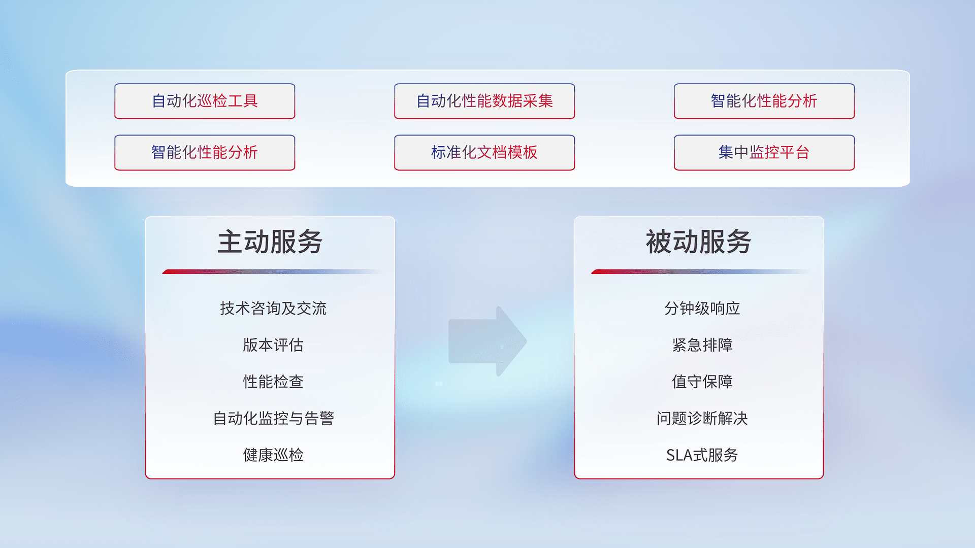 智能化工具和标准化文档,,,,保障服务质量,,提供主动服务(包含技术咨询、、、、版本评估、、、性能检查、、、、自动化监控与告警、、、健康巡检)和被动服务包含(分钟级响应、、、、紧急排障、、值守保障、、、、问题诊断解决、、、SLA服务)。。。。