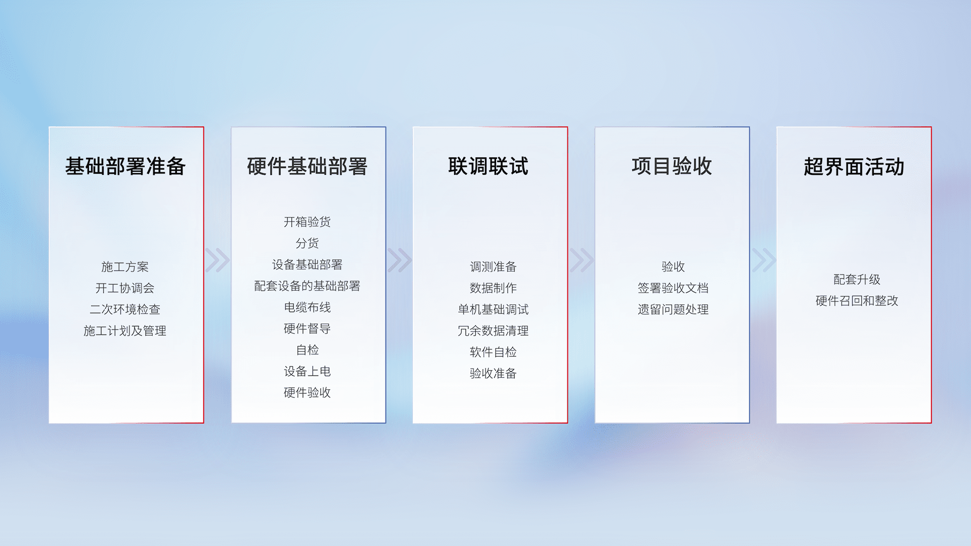 从基础部署准备、、硬件基础部署、、联调联试、、、项目验收、、、、越界面活动的全过程可追溯,,保证施工质量和进度。。。